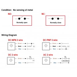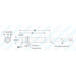 Thread: M8 3-wire polarity: NPN Voltage: DC 6-36 V Sensing distance: 2mm Output status: NC - normally closed Output current: 300mA Detection objects: conductor Total screw length: 50mm Sensing distance: 2mm +/- 10% Proximity signaling: LED flash