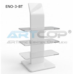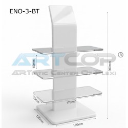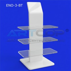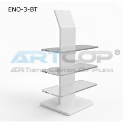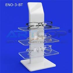 Material: The stand is made of plexiglass (acrylic). Body/Base: The main part of the stand (vertical wall) is made of white plexiglass, which gives it a clean and elegant appearance, providing a neutral background for the displayed products. Shelves: The display shelves are made of colorless, transparent plexiglass. This makes them discreet, maximizing the visibility of the glasses and creating the impression that the products are "floating" in the air. Shape: It has a vertical, rectangular structure with a series of horizontal shelves attached to the main panel. Branding: The stand may feature a logo placed at the top (if added in the visualization), which strengthens the brand.