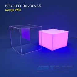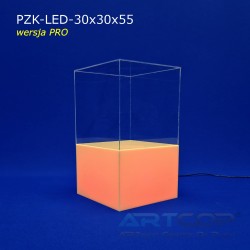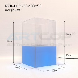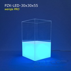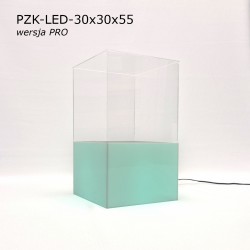 Pedestal 30 × 30 × 25 cm + transparent cover 30 × 30 × 30 cm (self-centering = aligns with the surfaces of the pedestal, does not slide sideways) + RGB LED lighting (full color)