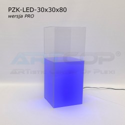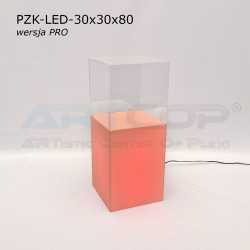 Pedestal 30 × 30 × 50 cm + transparent cover 30 × 30 × 30 cm (self-centering = aligns with the surfaces of the pedestal, does not slide sideways) + RGB LED lighting (full color)