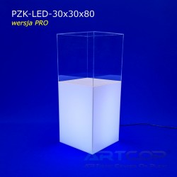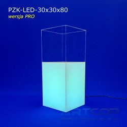 The column has been designed so that when the cover is placed on top, its edges align perfectly with the base. The structure is made of 5 mm plexiglass, complemented by a removable transparent acrylic glass cover of the same thickness. This makes the pedestal not only elegant in appearance but also ensures safe and aesthetic presentation of displayed items. LED lighting further enhances the presentation, while the built-in RGB LEDs allow for 17 different color settings to meet the visual expectations of any exhibitor. The controller makes it possible to program various color sequences, such as gradual color changes or pulsating effects.