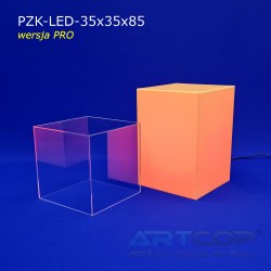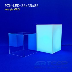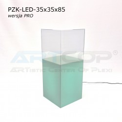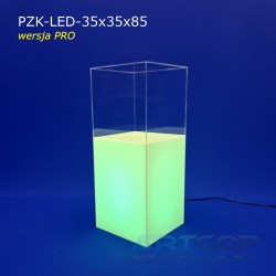 The column has been designed so that when the cover is placed on top, its edges align perfectly with the base. The structure is made of 5 mm plexiglass, complemented by a removable transparent acrylic glass cover of the same thickness. This makes the pedestal not only elegant in appearance but also ensures safe and aesthetic presentation of displayed items. LED lighting further enhances the presentation, while the built-in RGB LEDs allow for 17 different color settings to meet the visual expectations of any exhibitor. The controller makes it possible to program various color sequences, such as gradual color changes or pulsating effects.