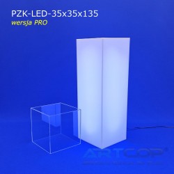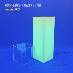 The column has been designed so that when the cover is placed on top, its edges align perfectly with the base. The structure is made of 5 mm plexiglass, complemented by a removable transparent acrylic glass cover of the same thickness. This makes the pedestal not only elegant in appearance but also ensures safe and aesthetic presentation of displayed items. LED lighting further enhances the presentation, while the built-in RGB LEDs allow for 17 different color settings to meet the visual expectations of any exhibitor. The controller makes it possible to program various color sequences, such as gradual color changes or pulsating effects.