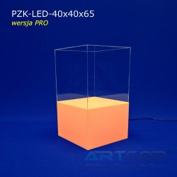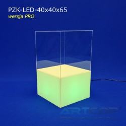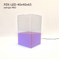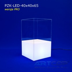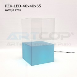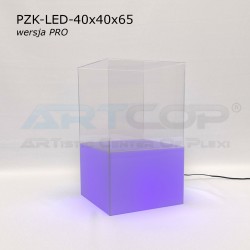 Pedestal 40 × 40 × 25 cm + transparent cover 40 × 40 × 40 cm (self-centering = aligns with the pedestal surfaces, does not slide sideways) + RGB LED lighting (full color)
