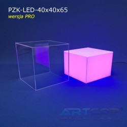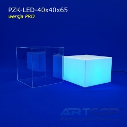 The column has been designed so that when the cover is placed on top, its edges align perfectly with the base. The structure is made of 5 mm plexiglass, complemented by a removable transparent acrylic glass cover of the same thickness. This makes the pedestal not only elegant in appearance but also ensures safe and aesthetic presentation of displayed items. LED lighting further enhances the presentation, while the built-in RGB LEDs allow for 17 different color settings to meet the visual expectations of any exhibitor. The controller makes it possible to program various color sequences, such as gradual color changes or pulsating effects.