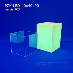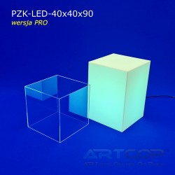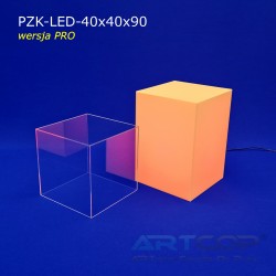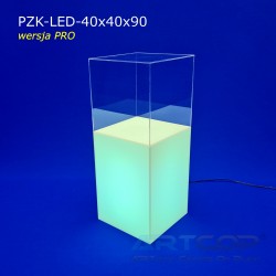 The column has been designed so that when the cover is placed on top, its edges align perfectly with the base. The structure is made of 5 mm plexiglass, complemented by a removable transparent acrylic glass cover of the same thickness. This makes the pedestal not only elegant in appearance but also ensures safe and aesthetic presentation of displayed items. LED lighting further enhances the presentation, while the built-in RGB LEDs allow for 17 different color settings to meet the visual expectations of any exhibitor. The controller makes it possible to program various color sequences, such as gradual color changes or pulsating effects.