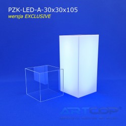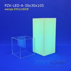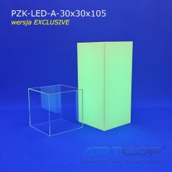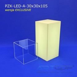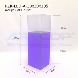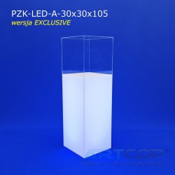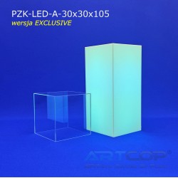 The column has been designed so that when the shade is placed, its edges align perfectly with the base. The structure is made of 5 mm thick plexiglass, complemented by a removable, transparent acrylic glass cover of the same thickness. This ensures the pedestal not only looks elegant but also guarantees the safe and aesthetic display of items. The LED backlighting further enhances the presentation of items showcased in the display. The RGB LEDs installed inside allow for the setting of 17 different colors, catering to the visual needs of every exhibitor. The controller allows programming of various color sequences, such as changing light colors over time or pulsing flickering effects.