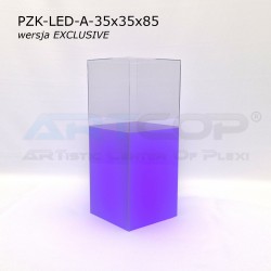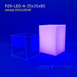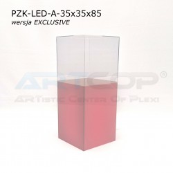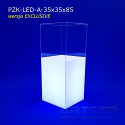 The column has been designed so that when the shade is placed, its edges align perfectly with the base. The structure is made of 5 mm thick plexiglass, complemented by a removable, transparent acrylic glass cover of the same thickness. This ensures the pedestal not only looks elegant but also guarantees the safe and aesthetic display of items. The LED backlighting further enhances the presentation of items showcased in the display. The RGB LEDs installed inside allow for the setting of 17 different colors, catering to the visual needs of every exhibitor. The controller allows programming of various color sequences, such as changing light colors over time or pulsing flickering effects.