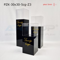 Pedestal 30×30×50 cm + clear cover 30×30×30 cm + UV logo print on one side of the pedestal