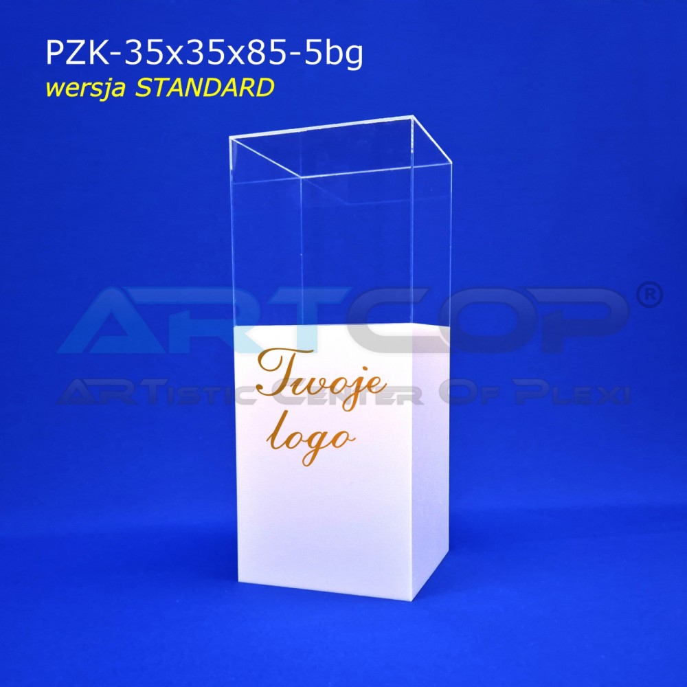 Podest z kloszem z nadrukiem logotypu, postument z plexi mlecznej 35x35x85 wersja STANDARD z plexi 5mm Cena 910,00 zł Szybki podgląd