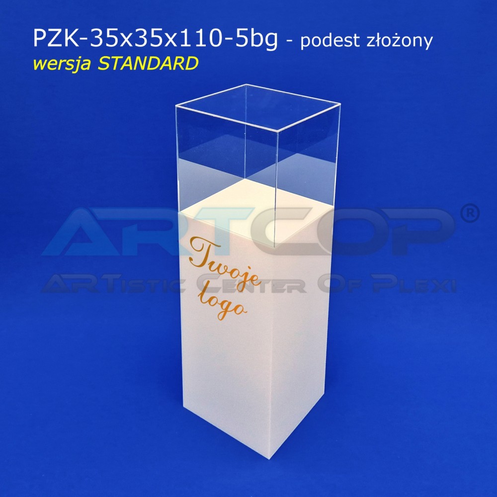 Podest z kloszem z nadrukiem logotypu, postument z plexi mlecznej 35x35x110 wersja STANDARD z plexi 5mm Cena 1 090,00 zł Szybki podgląd