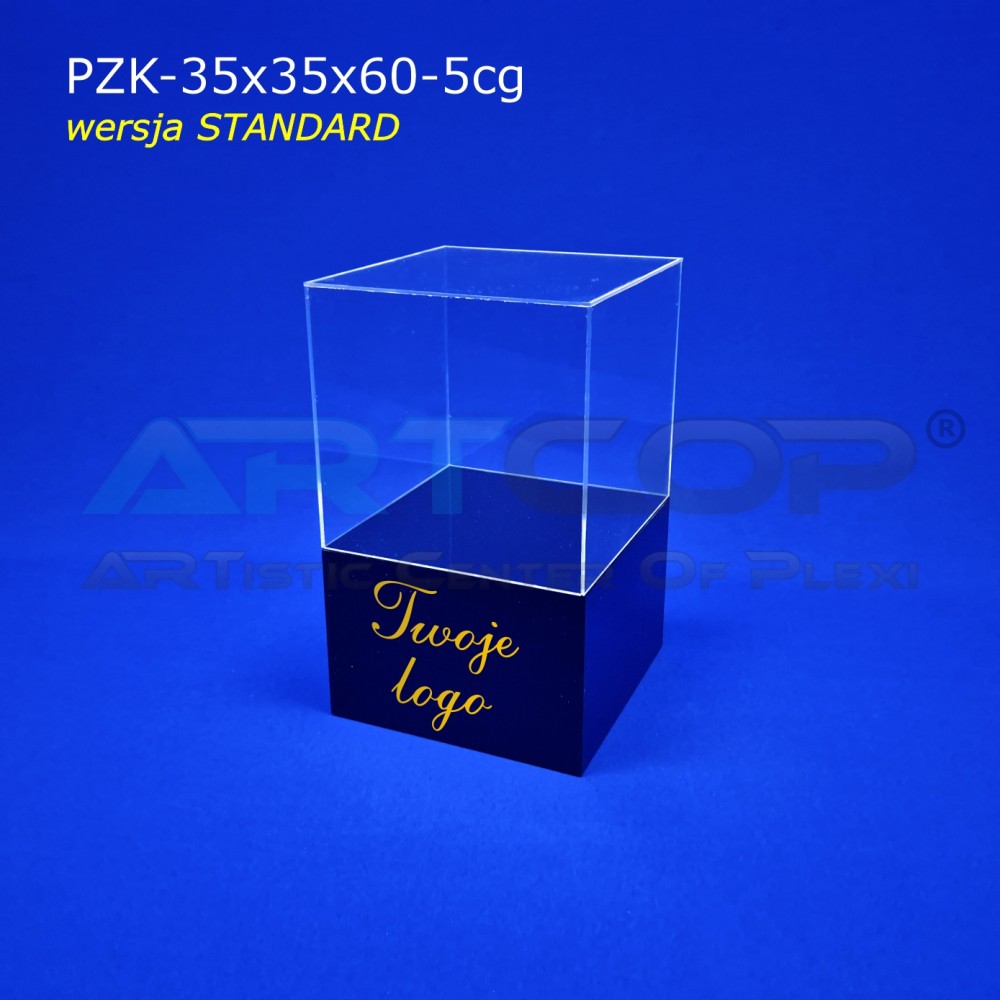 Podest z kloszem z nadrukiem logotypu, postument z plexi czarnej 35x35x85 wersja STANDARD z plexi 5mm Cena 945,00 zł Szybki podgląd
