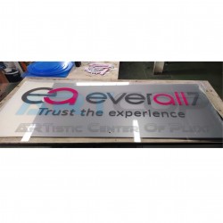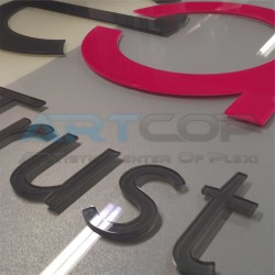 Założenie było jedno - ma wyjść świetnie! Tak też się stało. Plexi bezbarwna z podklejonym tyłem, do tego przestrzenne litery oklejone folią. Rezultat cieszy oko.