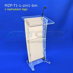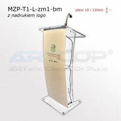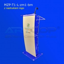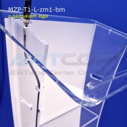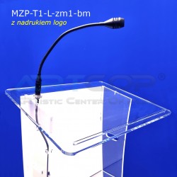 Elegancka mównica z plexi wyposażona w mikrofon na gęsiej szyi, z nadrukiem logo lub grafiki metodą druku bezpośredniego UV. Mikrofon i nadruk w cenie mównicy.