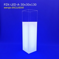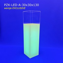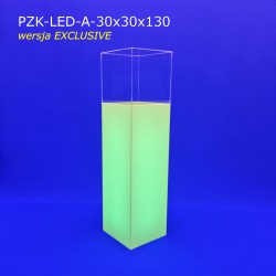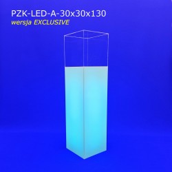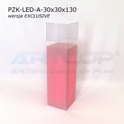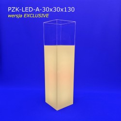 Kolumna została zaprojektowana w taki sposób, aby po nałożeniu klosza jego krawędzie idealnie licowały z podstawą. Konstrukcja wykonana jest z plexi o grubości 5 mm, a całość uzupełnia zdejmowana, przezroczysta pokrywa z akrylowego szkła o tej samej grubości. Dzięki temu podest nie tylko prezentuje się elegancko, ale także gwarantuje bezpieczne i estetyczne eksponowanie przedmiotów. Podświetlenie ledowe dodatkowo podkreśla prezentację przedmiotów eksponowanych w gablotce. Zainstalowane wewnątrz ledy RGB umożliwiają ustawienie 17 różnych barw zaspakajając oczekiwania wizualne każdego wystawcy. Sterownik umożliwia zaprogramowanie różnych sekwencji kolorystyczny, np. zmieniająca się barwa światła w czasie lub pulsujące migotanie.