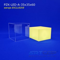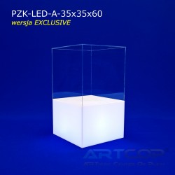 podest 35x35x25cm + klosz bezbarwny 35x35x35cm (samocentrujący = licuje się z powierzchniami kolumny, nie zsuwa się na boki) + podświetlenie ledowe RGB (fullcolor) + akumulator 2,3 Ah + ładowarka + zasilacz 12V.