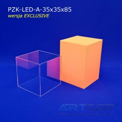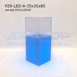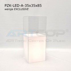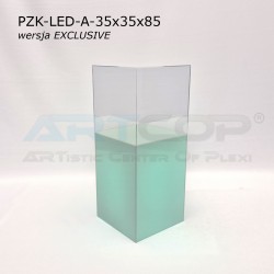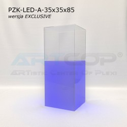 Kolumna została zaprojektowana w taki sposób, aby po nałożeniu klosza jego krawędzie idealnie licowały z podstawą. Konstrukcja wykonana jest z plexi o grubości 5 mm, a całość uzupełnia zdejmowana, przezroczysta pokrywa z akrylowego szkła o tej samej grubości. Dzięki temu podest nie tylko prezentuje się elegancko, ale także gwarantuje bezpieczne i estetyczne eksponowanie przedmiotów. Podświetlenie ledowe dodatkowo podkreśla prezentację przedmiotów eksponowanych w gablotce. Zainstalowane wewnątrz ledy RGB umożliwiają ustawienie 17 różnych barw zaspakajając oczekiwania wizualne każdego wystawcy. Sterownik umożliwia zaprogramowanie różnych sekwencji kolorystyczny, np. zmieniająca się barwa światła w czasie lub pulsujące migotanie.