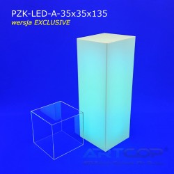 podest 35x35x100cm + klosz bezbarwny 35x35x35cm (samocentrujący = licuje się z powierzchniami kolumny, nie zsuwa się na boki) + podświetlenie ledowe RGB (fullcolor) + akumulator + ładowarka + zasilacz 12V.