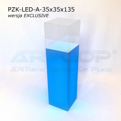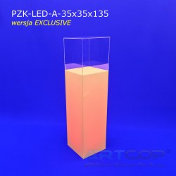 Kolumna została zaprojektowana w taki sposób, aby po nałożeniu klosza jego krawędzie idealnie licowały z podstawą. Konstrukcja wykonana jest z plexi o grubości 5 mm, a całość uzupełnia zdejmowana, przezroczysta pokrywa z akrylowego szkła o tej samej grubości. Dzięki temu podest nie tylko prezentuje się elegancko, ale także gwarantuje bezpieczne i estetyczne eksponowanie przedmiotów. Podświetlenie ledowe dodatkowo podkreśla prezentację przedmiotów eksponowanych w gablotce. Zainstalowane wewnątrz ledy RGB umożliwiają ustawienie 17 różnych barw zaspakajając oczekiwania wizualne każdego wystawcy. Sterownik umożliwia zaprogramowanie różnych sekwencji kolorystyczny, np. zmieniająca się barwa światła w czasie lub pulsujące migotanie.