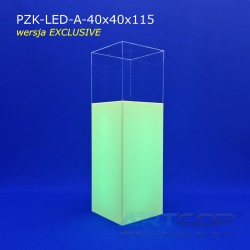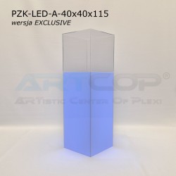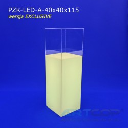 Kolumna została zaprojektowana w taki sposób, aby po nałożeniu klosza jego krawędzie idealnie licowały z podstawą. Konstrukcja wykonana jest z plexi o grubości 5 mm, a całość uzupełnia zdejmowana, przezroczysta pokrywa z akrylowego szkła o tej samej grubości. Dzięki temu podest nie tylko prezentuje się elegancko, ale także gwarantuje bezpieczne i estetyczne eksponowanie przedmiotów. Podświetlenie ledowe dodatkowo podkreśla prezentację przedmiotów eksponowanych w gablotce. Zainstalowane wewnątrz ledy RGB umożliwiają ustawienie 17 różnych barw zaspakajając oczekiwania wizualne każdego wystawcy. Sterownik umożliwia zaprogramowanie różnych sekwencji kolorystyczny, np. zmieniająca się barwa światła w czasie lub pulsujące migotanie.