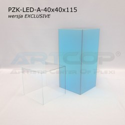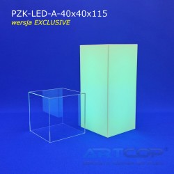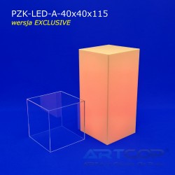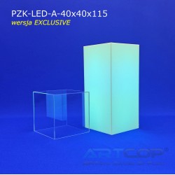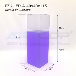 podest 40x40x75cm + klosz bezbarwny 40x40x40cm (samocentrujący = licuje się z powierzchniami kolumny, nie zsuwa się na boki) + podświetlenie ledowe RGB (fullcolor) + akumulator 7Ah + ładowarka + zasilacz 12V.