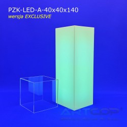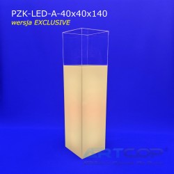 Kolumna została zaprojektowana w taki sposób, aby po nałożeniu klosza jego krawędzie idealnie licowały z podstawą. Konstrukcja wykonana jest z plexi o grubości 5 mm, a całość uzupełnia zdejmowana, przezroczysta pokrywa z akrylowego szkła o tej samej grubości. Dzięki temu podest nie tylko prezentuje się elegancko, ale także gwarantuje bezpieczne i estetyczne eksponowanie przedmiotów. Podświetlenie ledowe dodatkowo podkreśla prezentację przedmiotów eksponowanych w gablotce. Zainstalowane wewnątrz ledy RGB umożliwiają ustawienie 17 różnych barw zaspakajając oczekiwania wizualne każdego wystawcy. Sterownik umożliwia zaprogramowanie różnych sekwencji kolorystyczny, np. zmieniająca się barwa światła w czasie lub pulsujące migotanie.