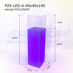 podest 40x40x100cm + klosz bezbarwny 40x40x40cm (samocentrujący = licuje się z powierzchniami kolumny, nie zsuwa się na boki) + podświetlenie ledowe RGB (fullcolor) + akumulator + ładowarka + zasilacz 12V.