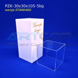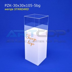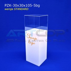 podest 30x30x75cm + klosz bezbarwny 30x30x30cm (samocentrujący = dopasowuje się z powierzchniami kolumny, nie zsuwa się na boki) + nadruk UV fullcolor logotypu na 1 ściance