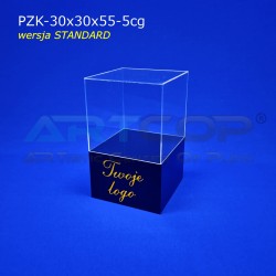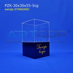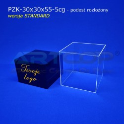 podest 30x30x25cm + klosz bezbarwny 30x30x30cm (samocentrujący = dopasowuje się z powierzchniami kolumny, nie zsuwa się na boki) + nadruk UV logotypu w fullcolor na 1 ściance