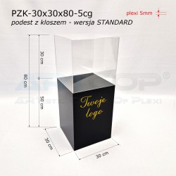 podest 30x30x50cm + klosz bezbarwny 30x30x30cm (samocentrujący = dopasowuje się z powierzchniami kolumny, nie zsuwa się na boki) + nadruk UV w fulcolor logotypu na 1 ściance
