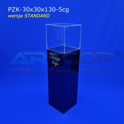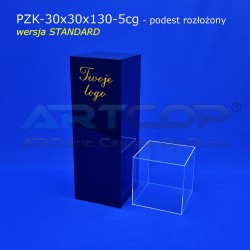 podest 30x30x100cm + klosz bezbarwny 30x30x30cm (samocentrujący = dopasowuje się z powierzchniami kolumny, nie zsuwa się na boki) + nadruk UV w fullcolor logotypu na 1 ściance