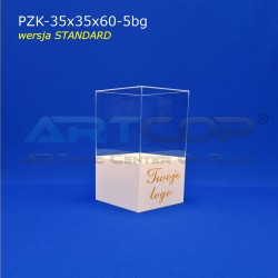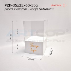 podest 35x35x25cm + klosz bezbarwny 35x35x35cm (samocentrujący = dopasowuje się z powierzchniami kolumny, nie zsuwa się na boki) + nadruk logotypu na 1 ścianie