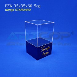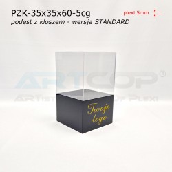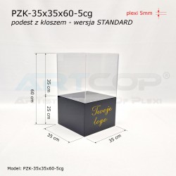 podest 35x35x25cm + klosz bezbarwny 35x35x35cm (samocentrujący = dopasowuje się z powierzchniami kolumny, nie zsuwa się na boki) + nadruk logotypu na 1 ścianie