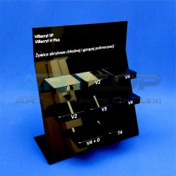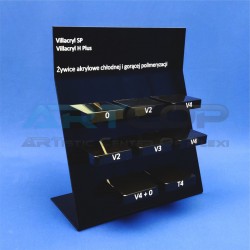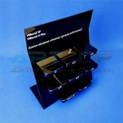 Stojak skośny z półkami na protezy. Prezenter wykonany z czarnej plexi, dodatkowo nadruk UV